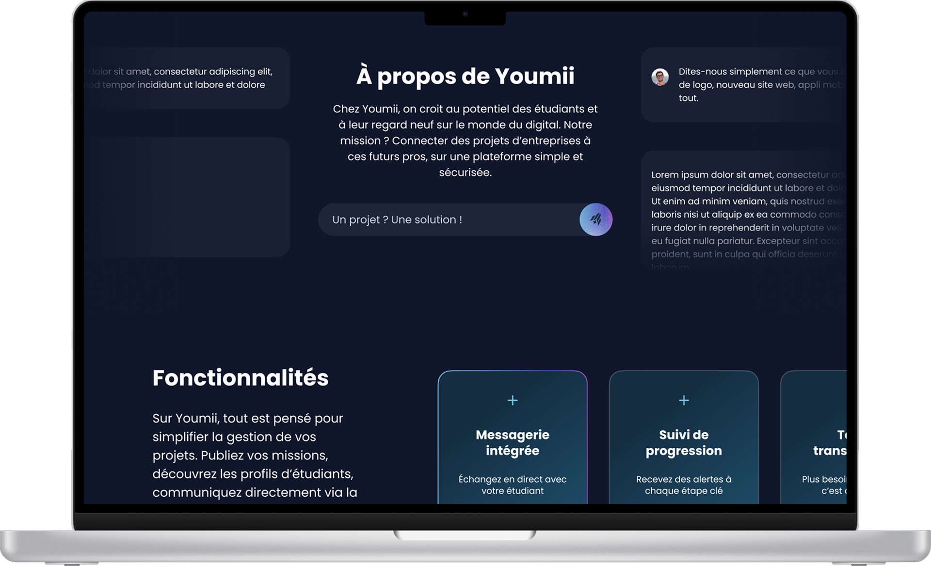 Youmii is a collaboration platform connecting project owners with freelance student digital creators. It helps businesses, associations, and entrepreneurs easily find creative talents on a controlled budget, while offering students real-world missions to build their portfolios and gain professional experience. The name comes from “You & Me” symbolizing a friendly yet serious relationship where every project becomes a shared ground for exchange and learning.